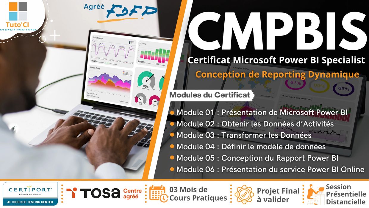 Le Certificat Microsoft Power BI Specialist (CMPBIS) vise le développement de connaissances et compétences techniques avec MS Power BI.
