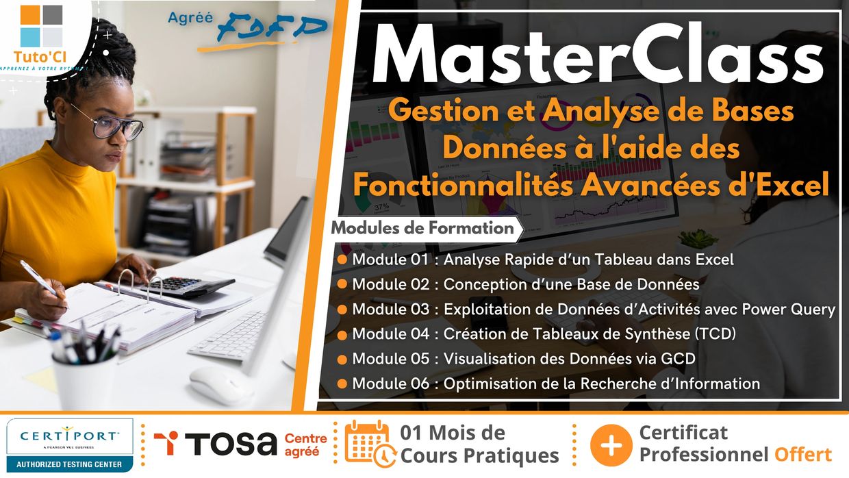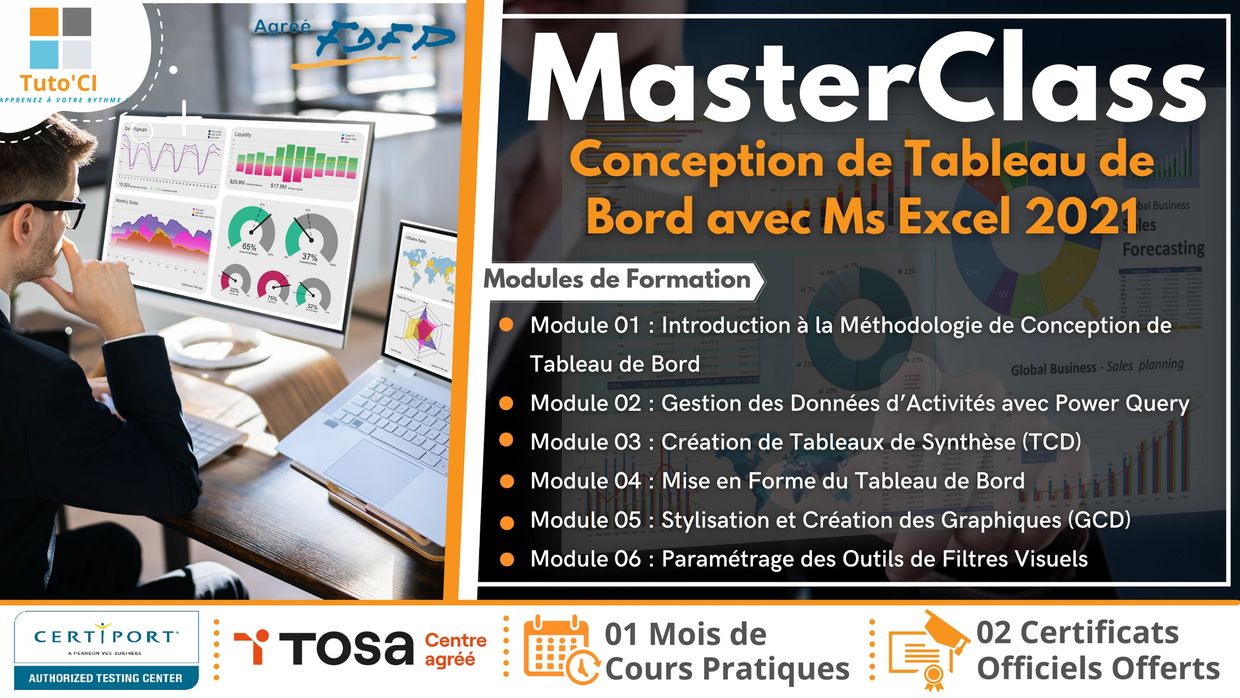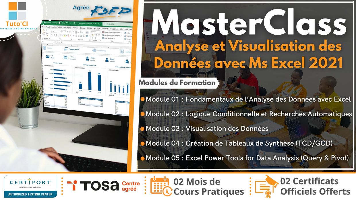 Cette MasterClass se focalise sur l'utilisation d'Excel, de Power Query, des tableaux croisés dynamiques et de la visualisation des données.