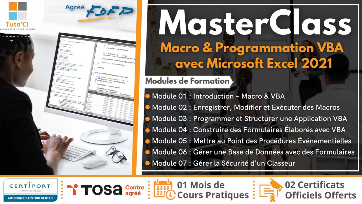 Cette formation prépare à la validation de la Certification TOSA VBA Excel et la Certification Microsoft Office Specialist (MOS) Excel.